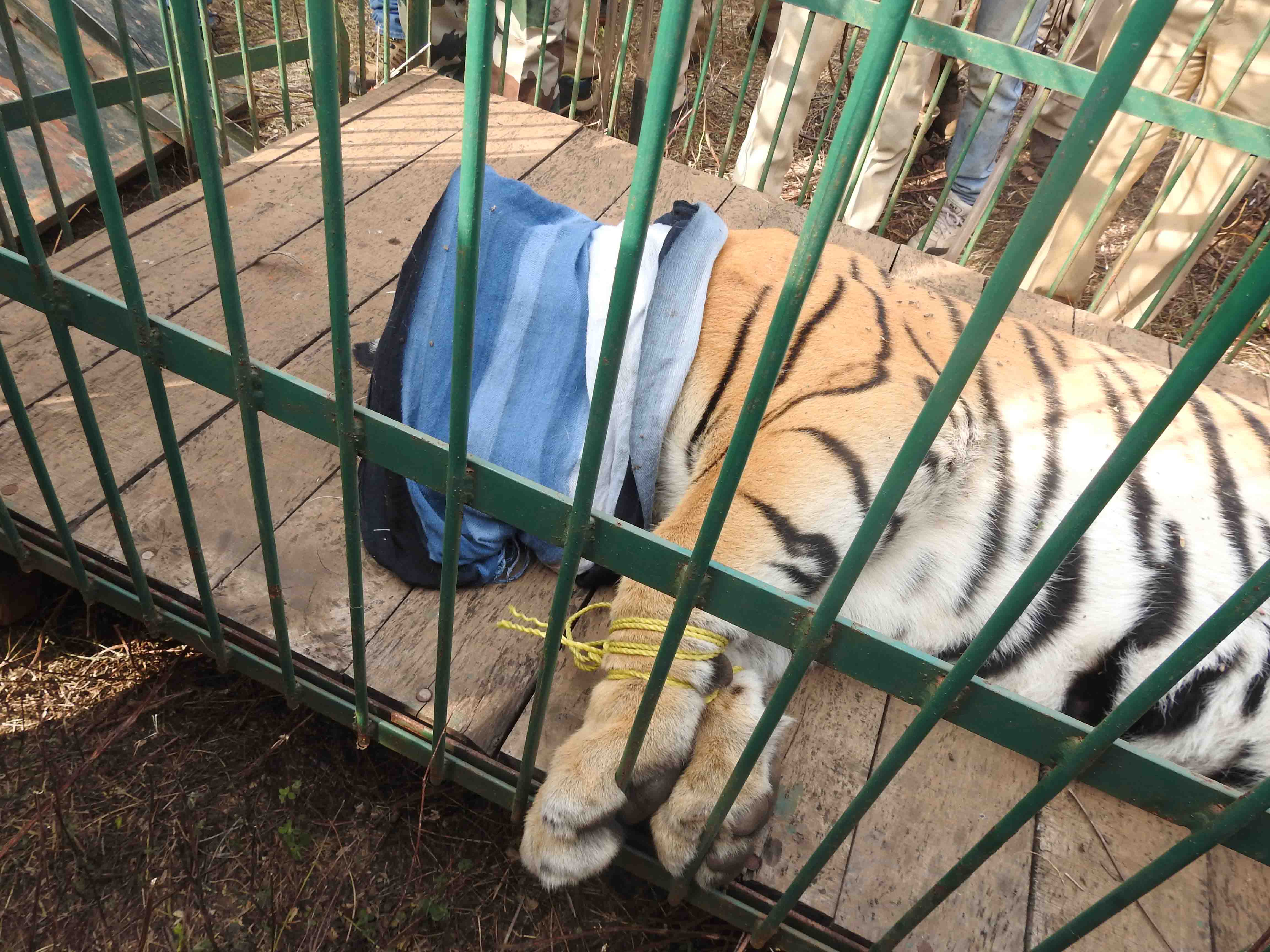 Forty minutes later I was hand-in-paw with the tiger – of course now under complete sedation. I took my own sweet time to get acquainted with him; he did after all want to make friends remember?! A beautiful tiger, but the wart-like growth on his snout concerned me as much as his strange lack of fear of humans. Could they somehow be linked?