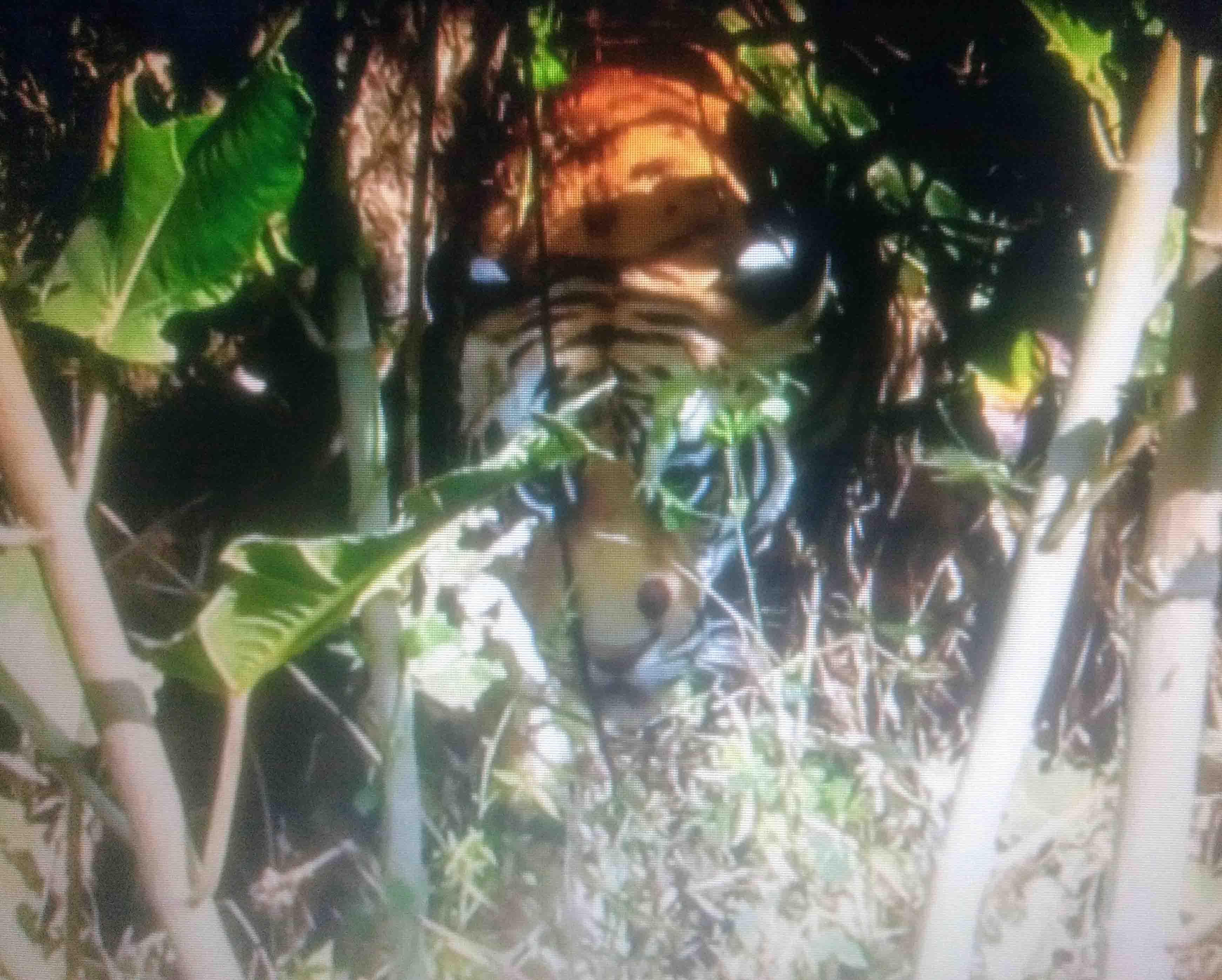 This time the urgency was more audible in his calm voice – and, and my eyes met those of the tiger. Crouching low barely 10 meters away its eyes were just about visible amongst the forest undergrowth. We beat a hasty yet calm retreat. Nikhil, our field biologist, had the presence of mind to collect the memory card from the camera trap, which we had installed on the tiger’s kill the previous day. We had to be sure of the identity of the tiger we had come to rescue.