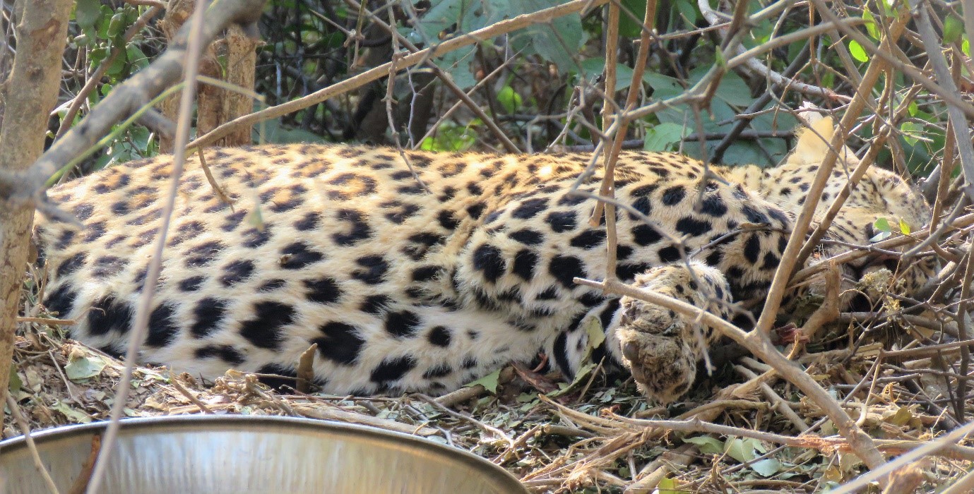The leopard had been apparently in the same spot for the last four days and owing to it being obscured by bushes, the local forest department staff were not sure as to why the leopard had not left the spot. It was hidden at a place that anyone would find it hard to figure why a predator would decide to be in one spot. Something must be very wrong!
