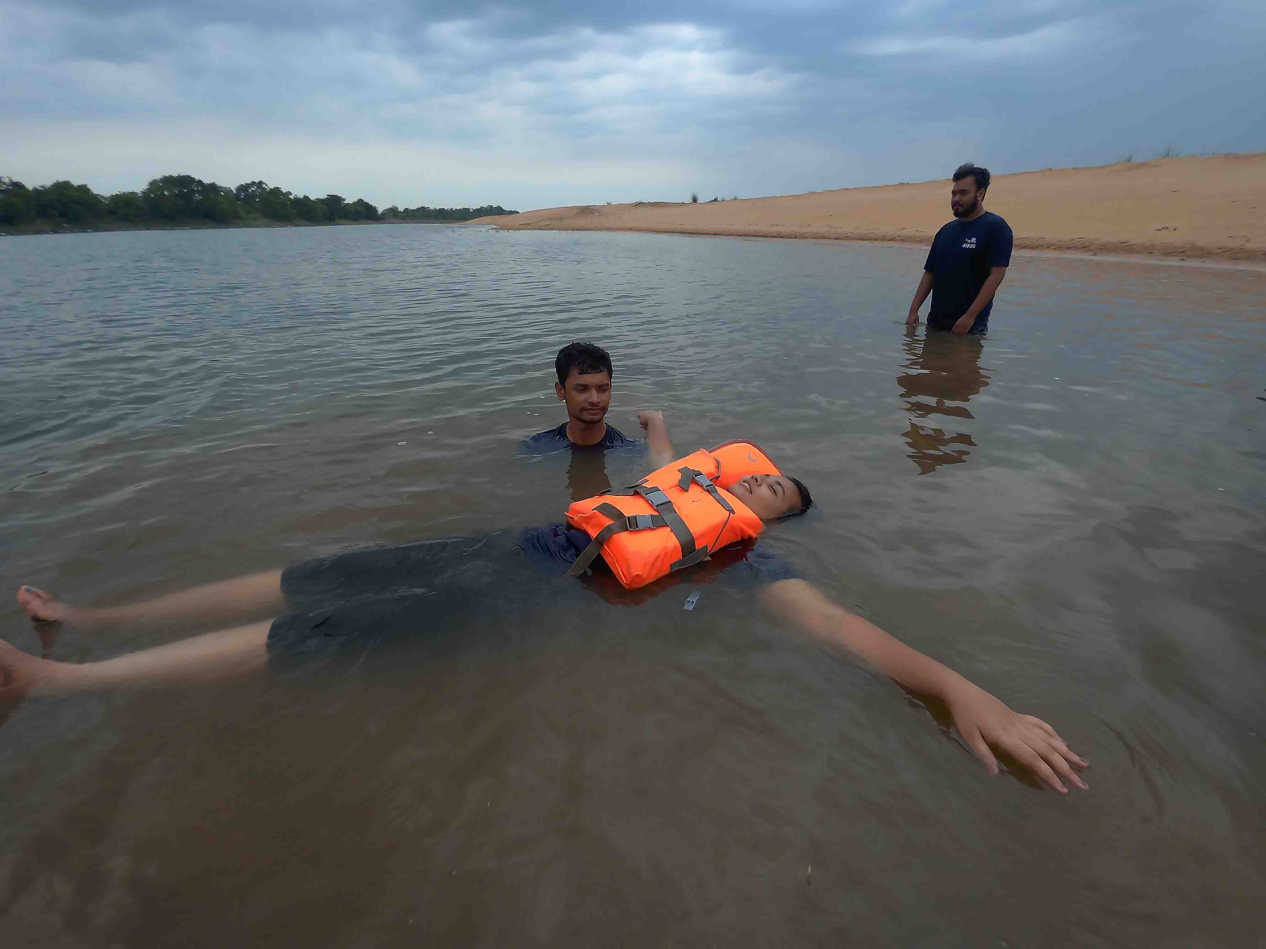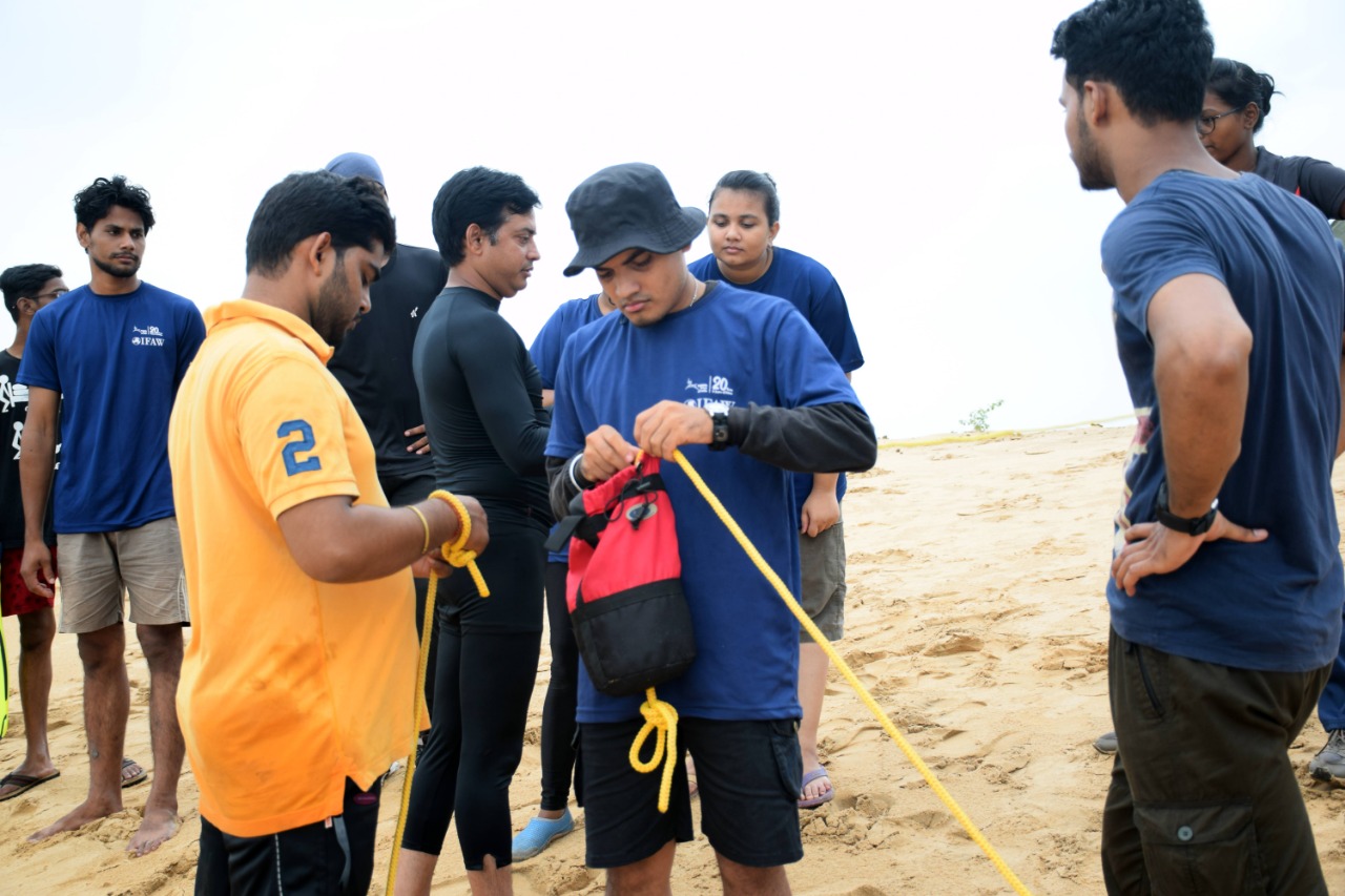 The first rule of rescue is to be able to save yourself from disaster. Following this rule, the workshop detailed about the safety precautions to take when navigating a water body in search of stranded animals. The trainees were instructed and demonstrated the four thumb rules of water rescue technique: Throw-Reach-Row-Jump.