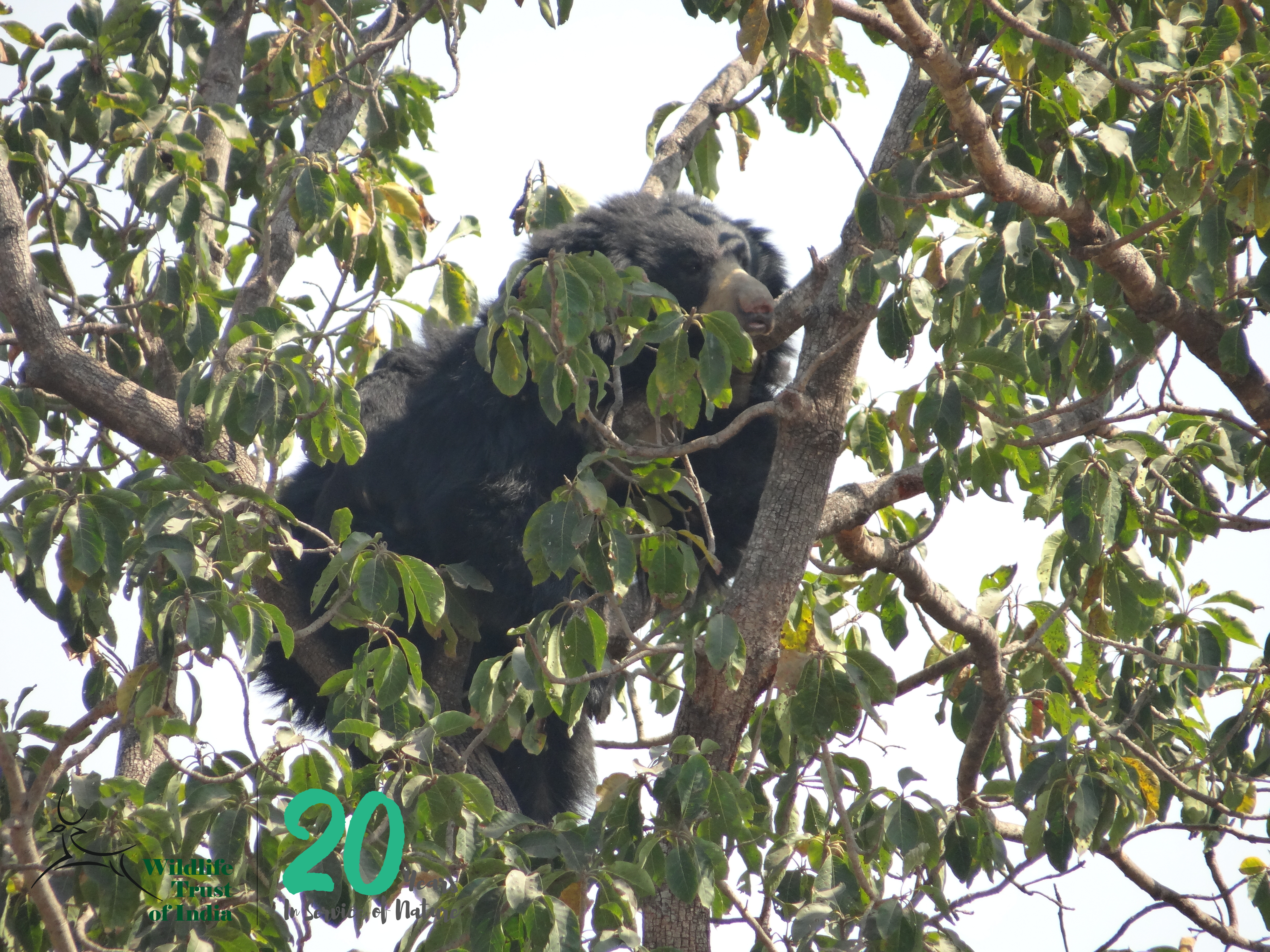 Wildlife Trust of India’s Rapid Response Team posted in Bramhapuri in the Vidarbha landscape attended to this bear rescue case. After finishing the post-mortem procedure of a tiger, they received a call regarding a sloth bear which had climbed on a tree in a farm and the villagers had gathered all around the tree. The team was about 50km away from the spot and as soon as I got a call from them, I collected the camera, binoculars and caution tapes and rushed to the spot.