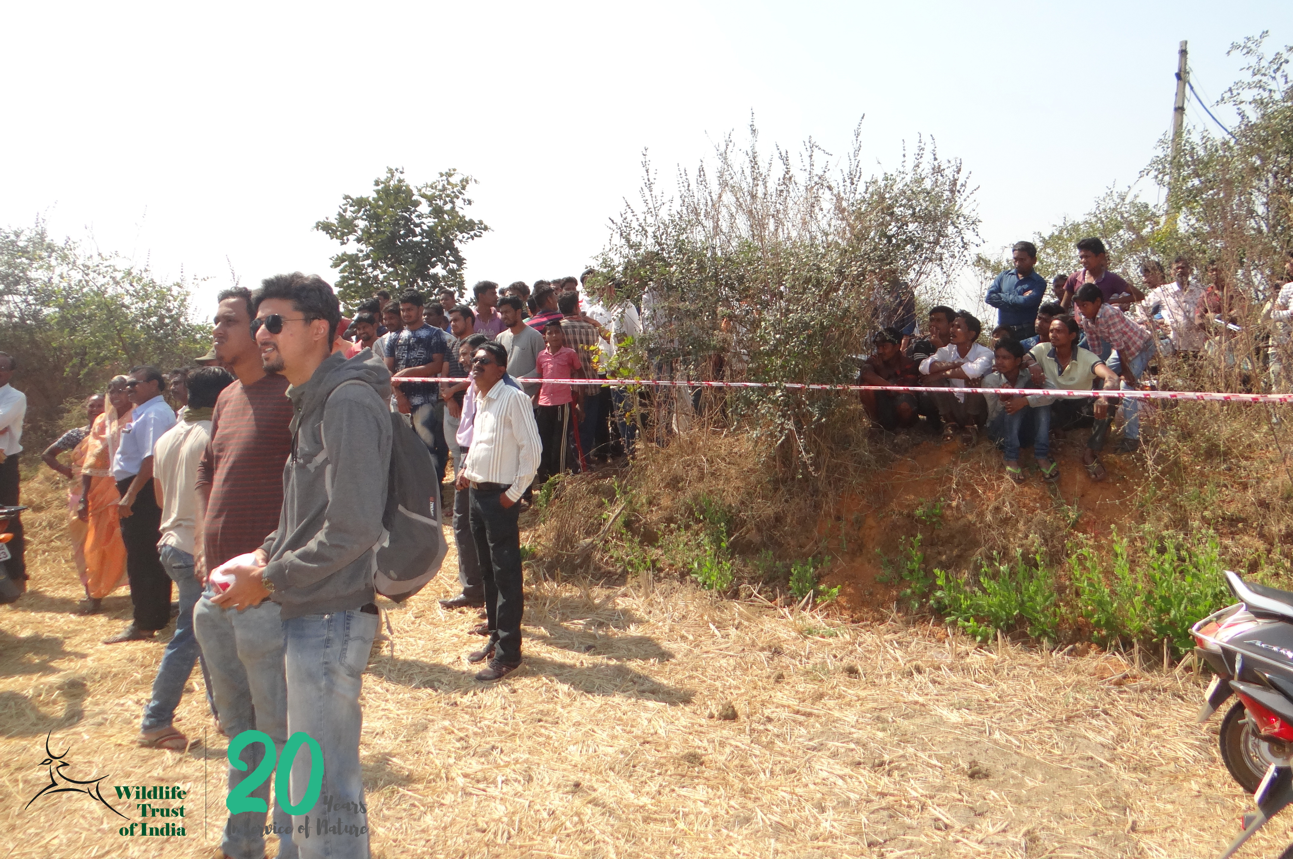 We checked the status of the bears and ensured that both of them were safe. Our sociologist had already started to calmly talk to the gathered crowd and the entire RRT now started helping him, requesting and reasoning with the crowd to maintain a safe distance. A perimeter of 100m was created around the tree using caution tapes and ropes, for the bear to feel safe to climb down and we had stationed small teams on all sides, at a safe distance, so as to not lose sight of the bear in the tall grass once it climbs down.