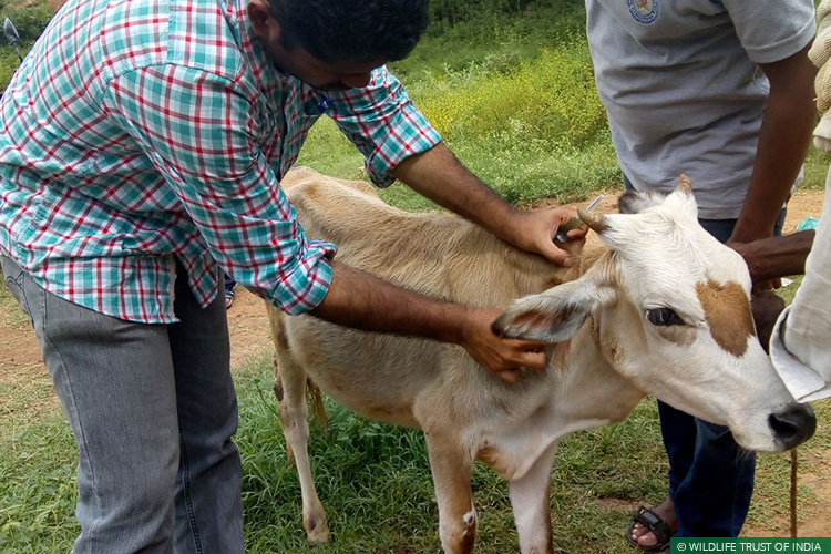 While the MVS team was at the village, the leopard attacked a villager and went on to attack a calf. The man was not injured although his clothes were ripped. The calf had bite and scratch marks on its lower neck and the lateral aspect of the abdomen. The MVS veterinarian treated the calf and a baited trap cage was placed in the area in an attempt to capture the leopard.