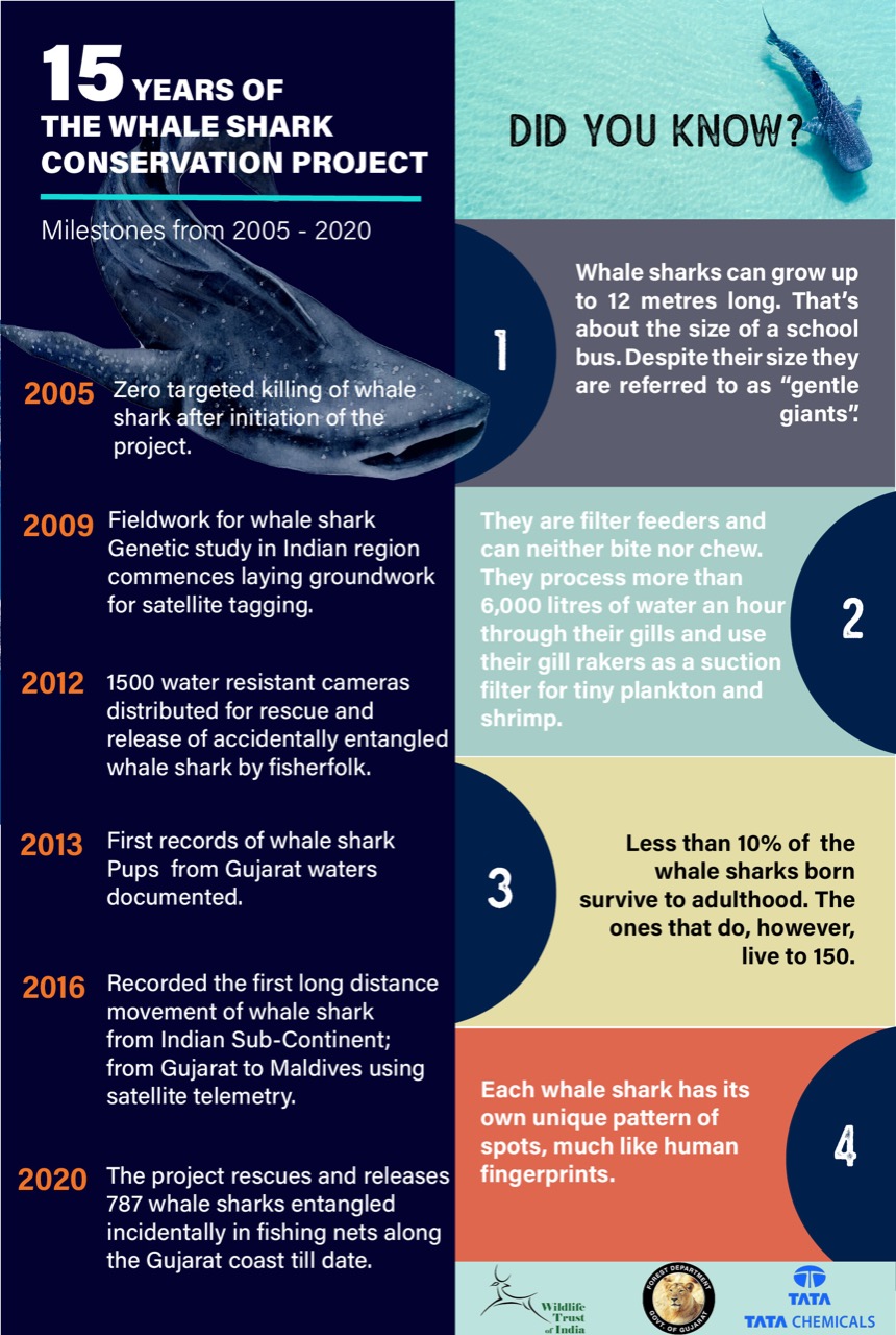 Whale shark, the world’s largest fish is endangered and the first species of fish to enjoy protection at par to that of the tigers, lions and elephants in India. Large scale hunting of the whale shark in Gujarat had prompted Wildlife Trust of India to launch a campaign with Tata Chemicals Limited in 2004.