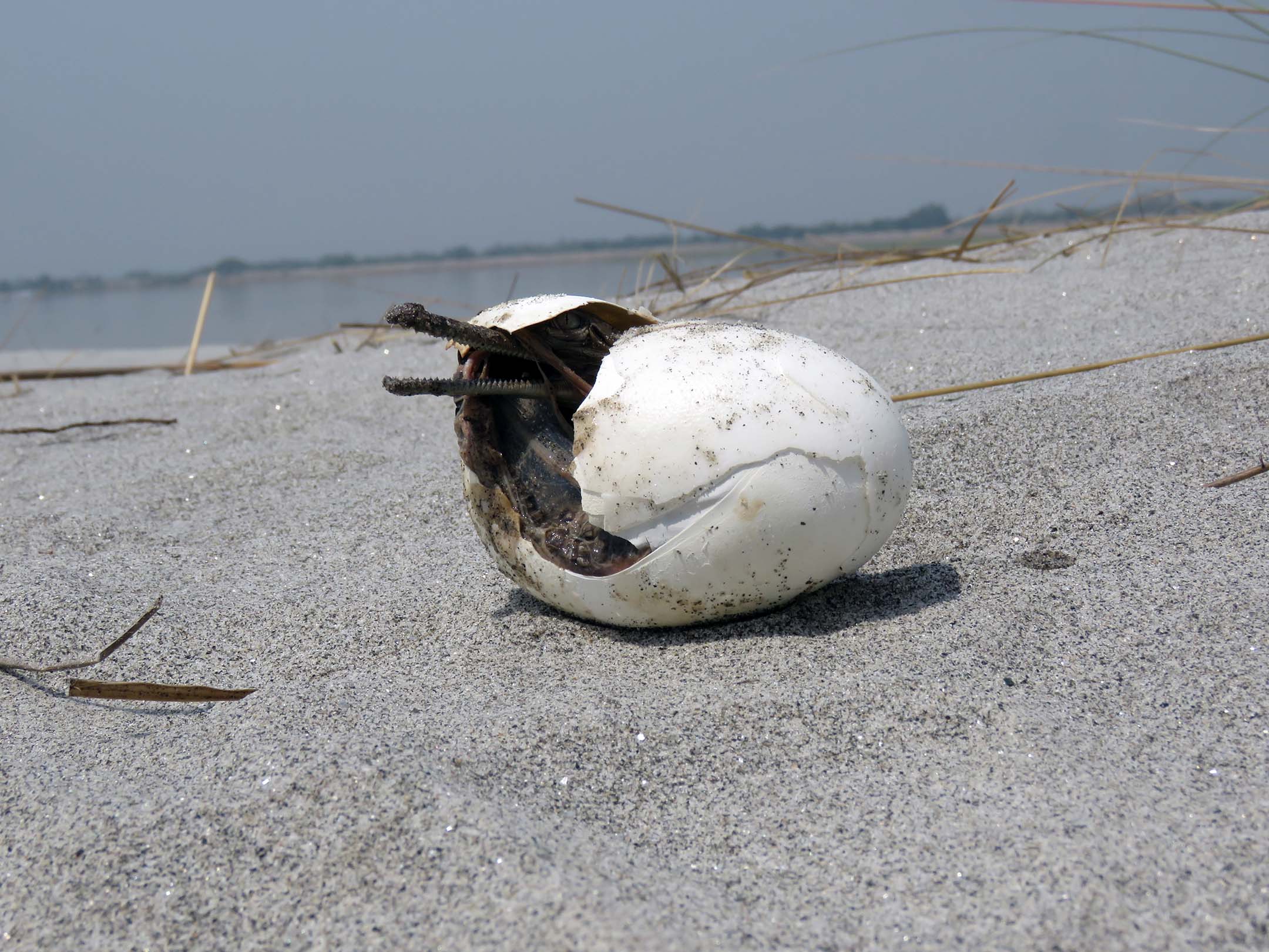 The Gharial which normally nests within 2-3 meters of the waterline with a clutch size of about 30 eggs in the Gandak River bank needs hands on conservation with egg relocation in-situ to ensure safe hatching away from predation and riverine erosion. This has been the focus of the WTI’s Gandak Gharial Recovery Project since 2014 with conservation translocations of captive bred and reared gharials since the discovery of gharial nests in 2016. Nest protection continues to be the major thrust in this project supported by the Dept. of Environment, Forest And Climate Change, Govt. of Bihar and the Los Angeles Zoo and Botanical Gardens.