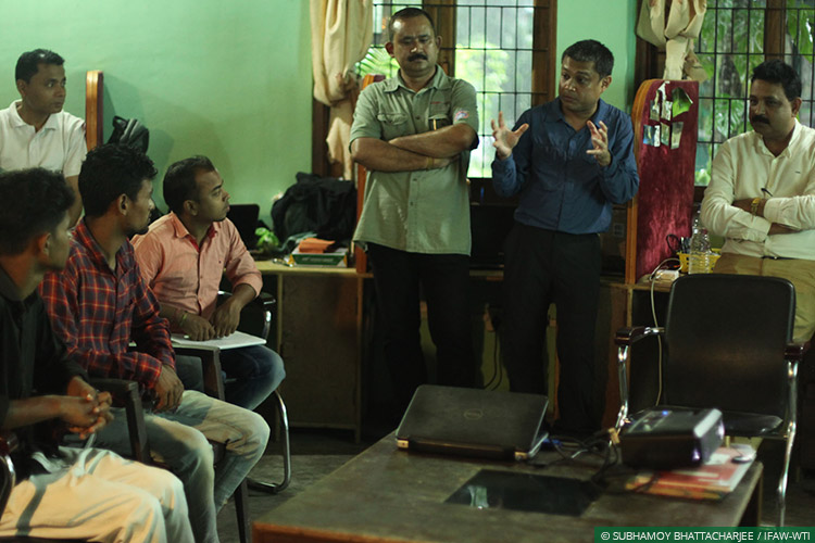 The meeting on June 13 consequently focused on educating participants about basic wildlife safety protocols to be followed during the annual floods. Uttam Saikia, the Honorary Wildlife Warden of Kaziranga National Park began proceedings by explaining the necessity of such pre-flood awareness training for those volunteering to save wildlife in crisis situations. WTI Joint Director and CWRC centre-in-charge Dr Rathin Barman spoke about the challenges that both people and wildlife faced during the floods, and how these could be tackled while causing the least possible disturbance to wildlife in distress. CWRC veterinarians Dr Panjit Basumatary and Dr Samshul Ali provided a veterinary and wild rescue perspective on the flood crisis and explained how volunteers could help CWRC Mobile Veterinary Service teams ensure the betterment of distressed wildlife. Dilip Deori, Manager and Project lead of WTI’s Karbi-Anglong Conservation Project spoke about the importance of securing animal corridors during the floods.