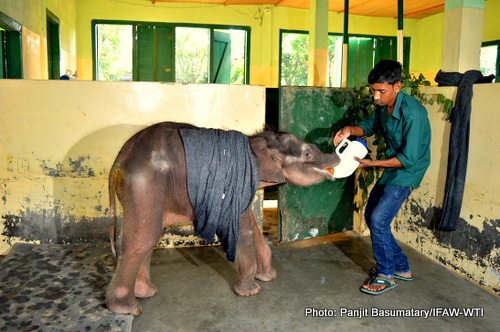CWRC, May 16, 2015: A lone male elephant calf was rescued by the villagers and Forest Department personnel from Sonpura Range under Lohit Forest Division in Arunachal Pradesh on May 11, 2015. The calf was taken to Center for Bear Rehabilitation and Conservation (CBRC), Pakke, for preliminary observation and then admitted to Center for Wildlife Rehabilitation and Conservation (CWRC), the IFAW-WTI run animal welfare centre, on Saturday, May 16, 2015.