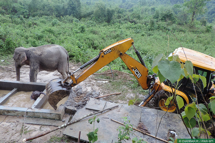 A forest department team comprising Divisional Forest Officer Tana Tapi, Deputy Ranger Tado and frontline staff accompanied MVS veterinarian Dr Rinku Gohain and animal keepers Doluk Dagang and Biri Aman to the village at around 6.00am. The mother was chemically restrained and the team first tried to get the calf out of the tank manually, but to no avail. A JCB was then called in; the walls of the tank were partially broken down and some earth deposited into it. Eventually, after struggling for about half an hour, the calf was able to make its way out.