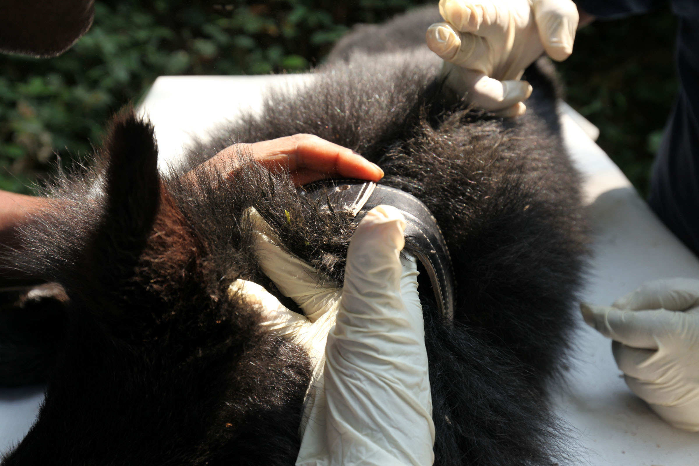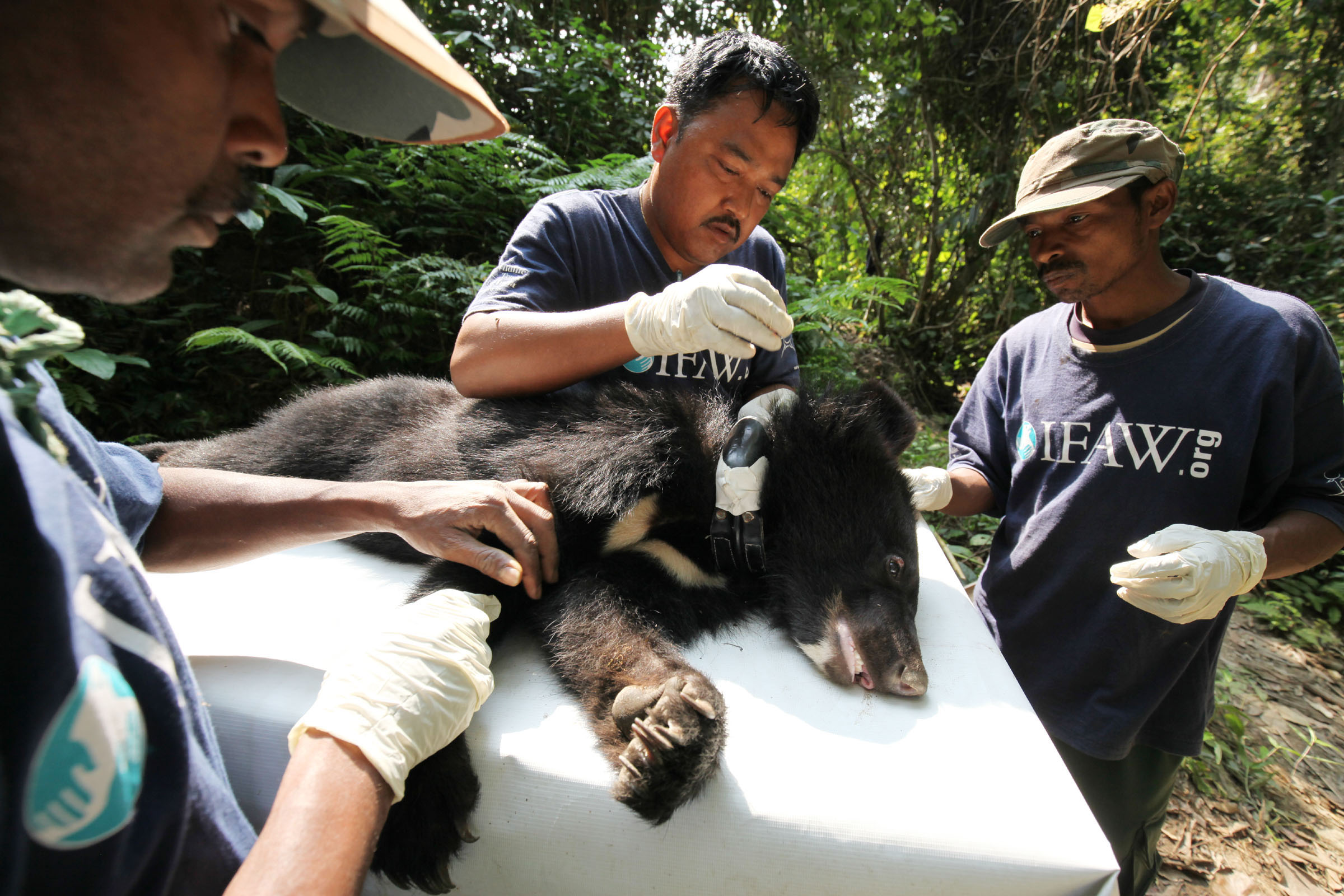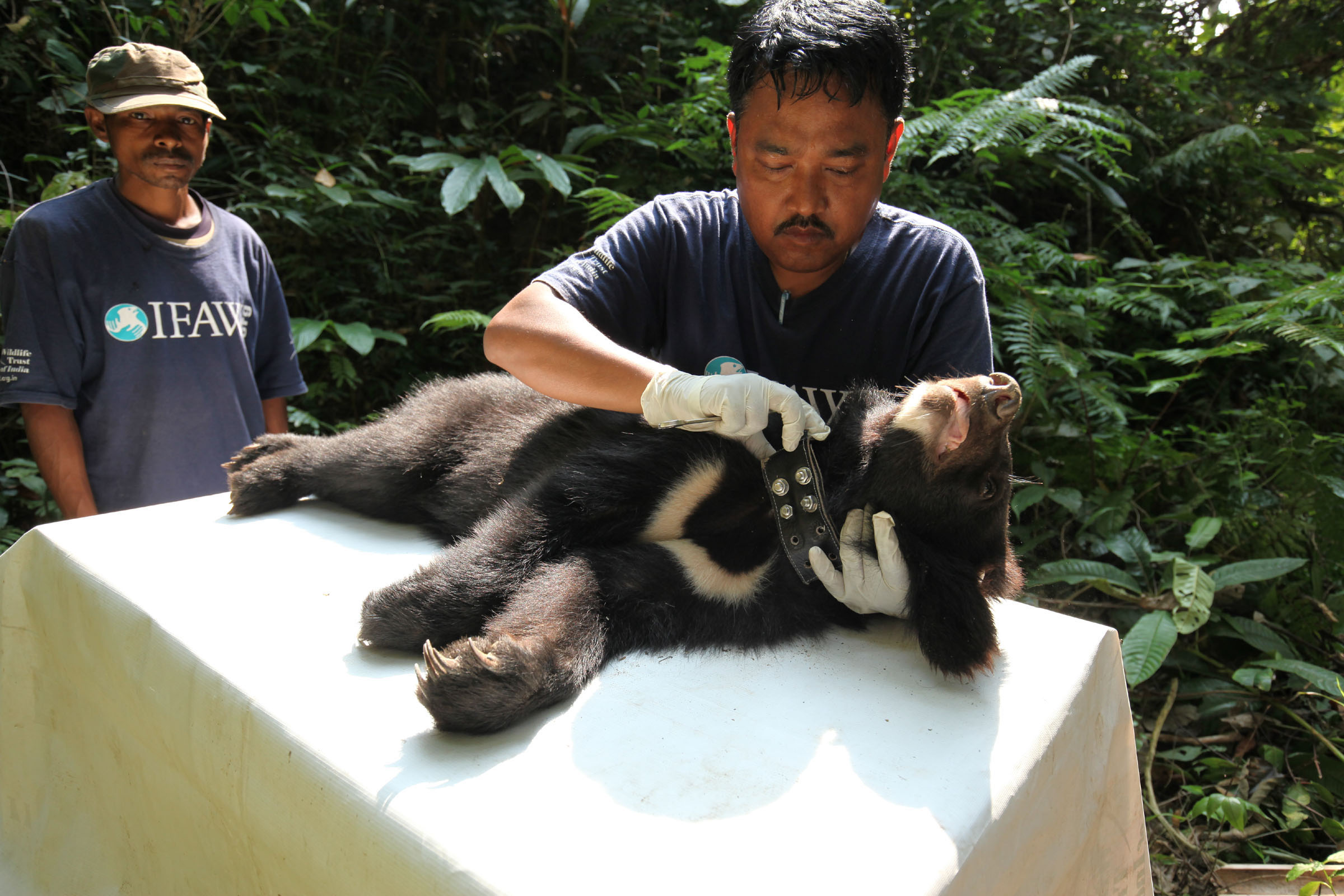 The female bear cub is radio-collared by Dr Rinku Gohain, the IFAW-WTI veterinarian at the rehabilitation site in Pakke Tiger Reserve in Arunachal Pradesh. It is one of the two cubs that were rescued by the Assam forest department rescue team from a household in Karbi Anglong district of Assam in January 2018.