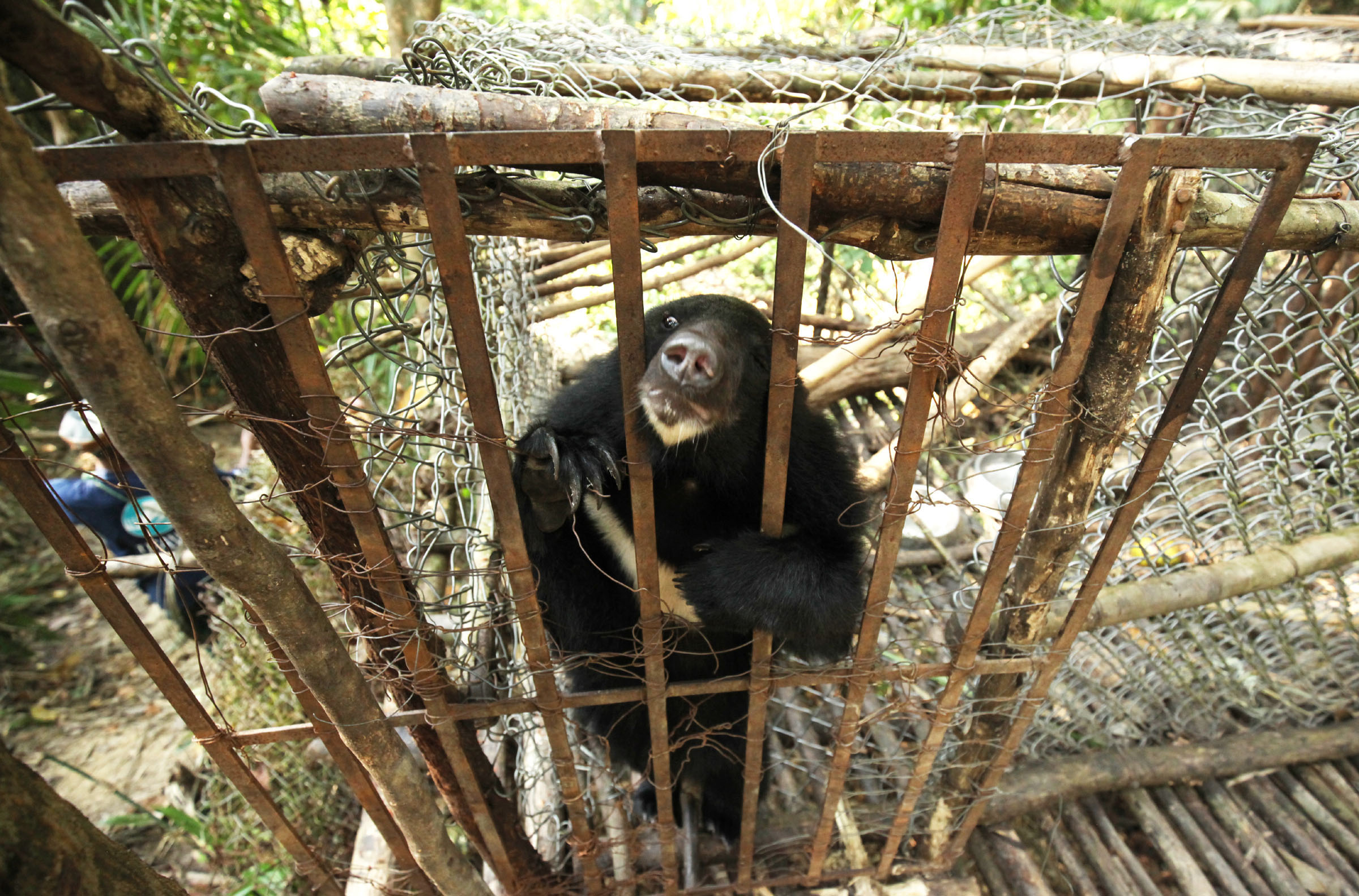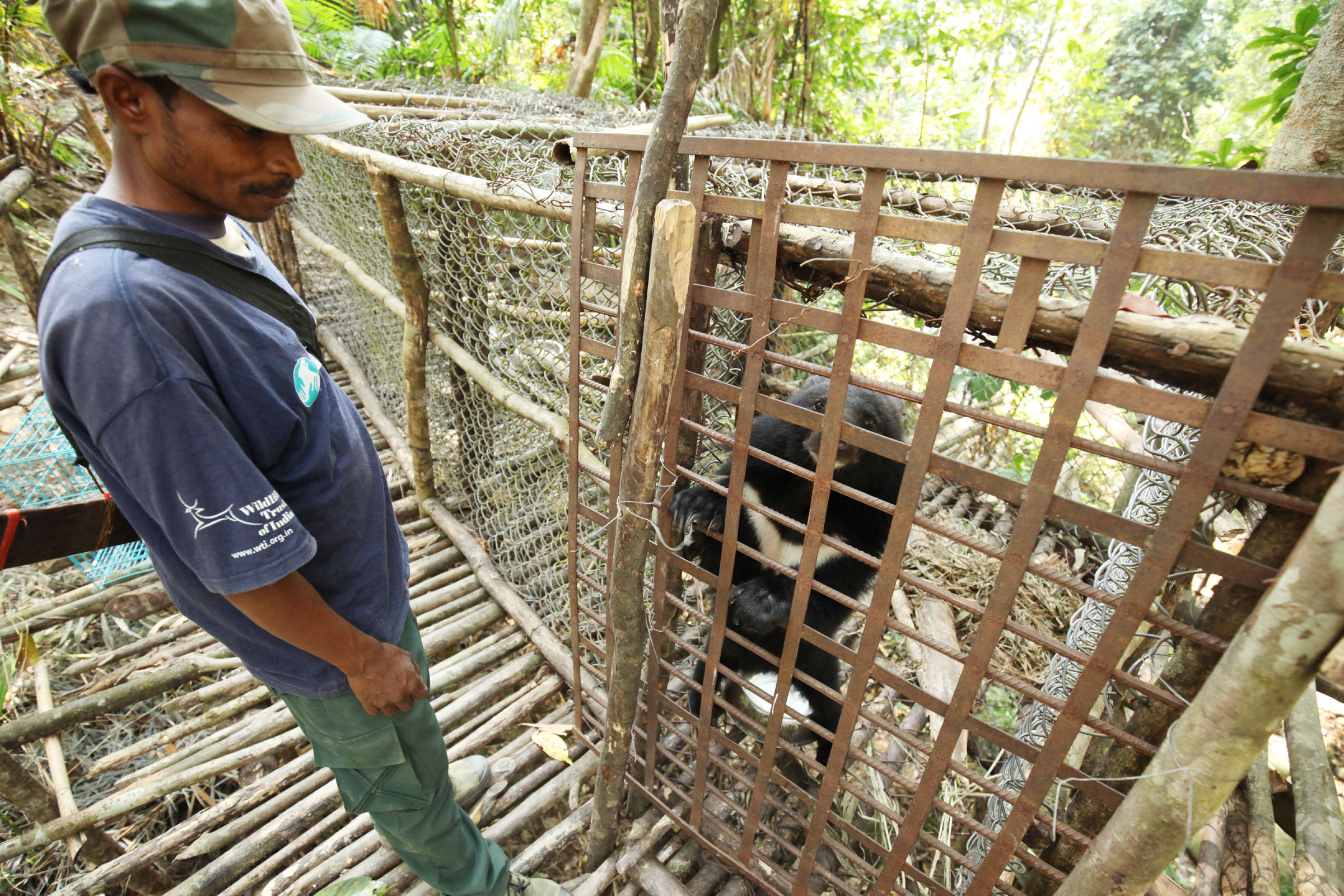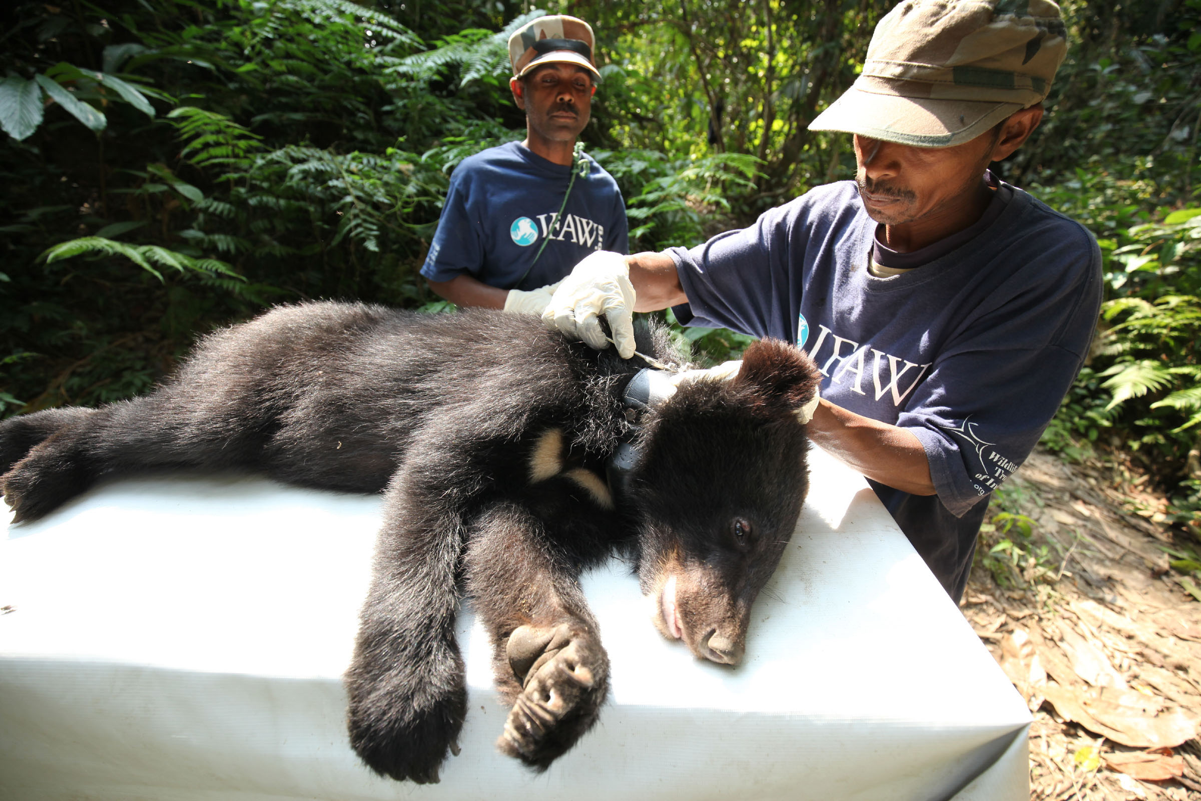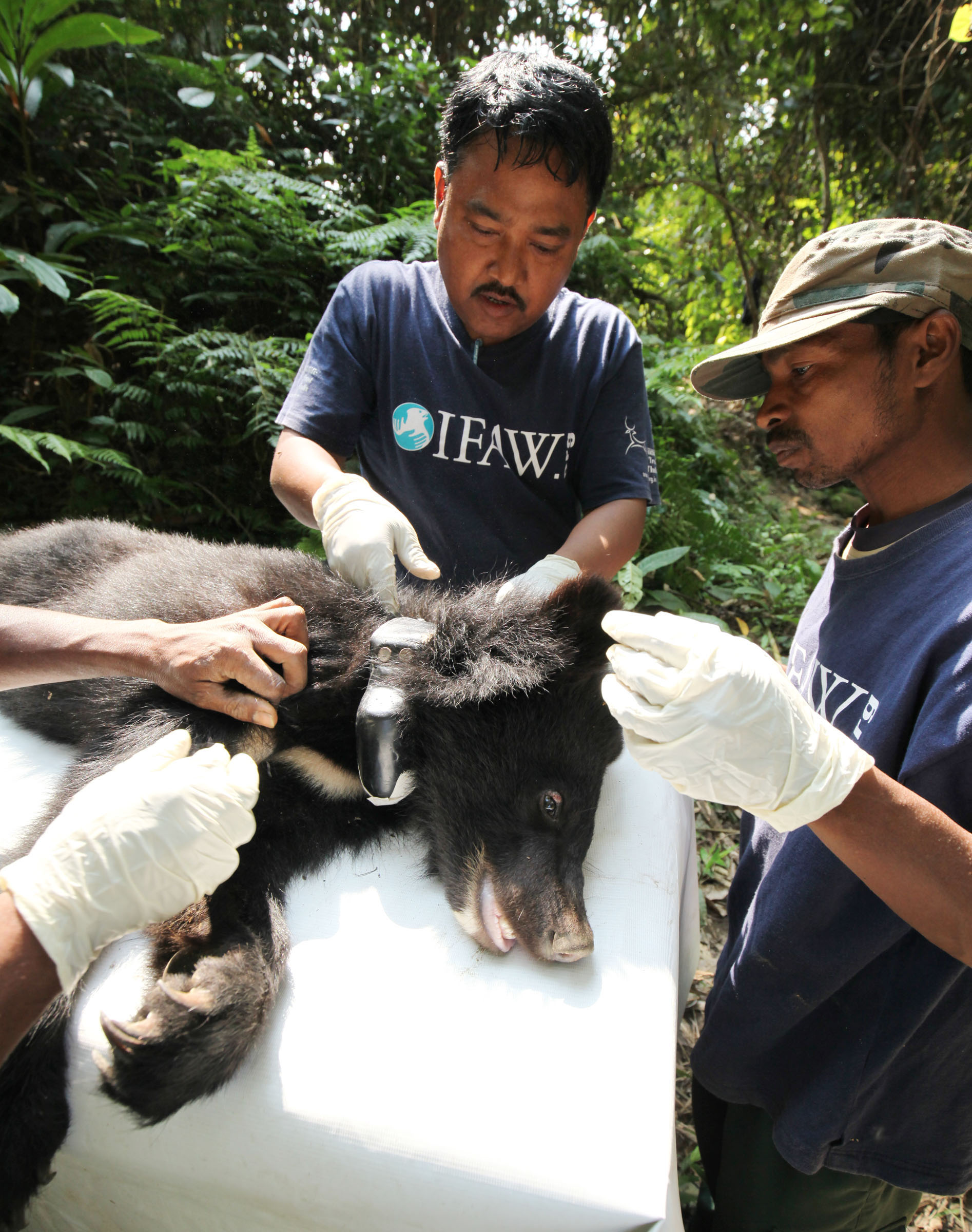 The female bear cub is radio-collared by Dr Rinku Gohain, the IFAW-WTI veterinarian at the rehabilitation site in Pakke Tiger Reserve in Arunachal Pradesh. It is one of the two cubs that were rescued by the Assam forest department rescue team from a household in Karbi Anglong district of Assam in January 2018.