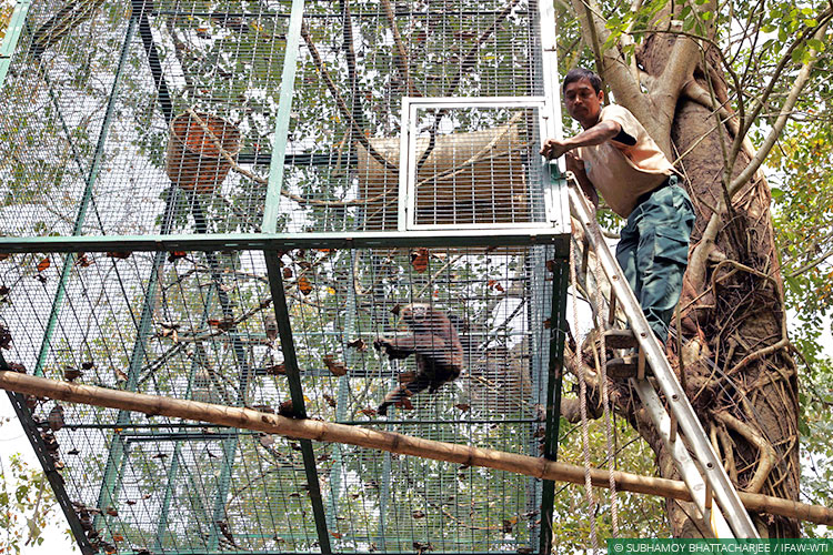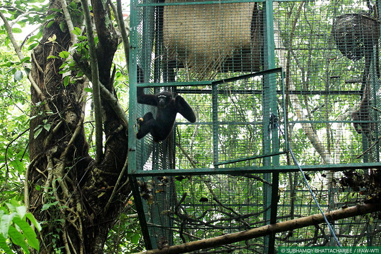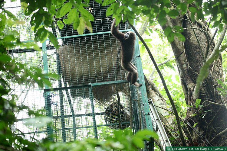 CWRC, Kaziranga National Park, June 14, 2017: A pair of western hoolock gibbons under long-term care at the Centre for Wildlife Rehabilitation and Conservation (CWRC) – the wildlife rescue, care and rehabilitation facility jointly run by the International Fund for Animal Welfare (IFAW), Wildlife Trust of India (WTI) and Assam Forest Department – was released into the wild in the Kaziranga-Karbi Anglong landscape early yesterday morning.