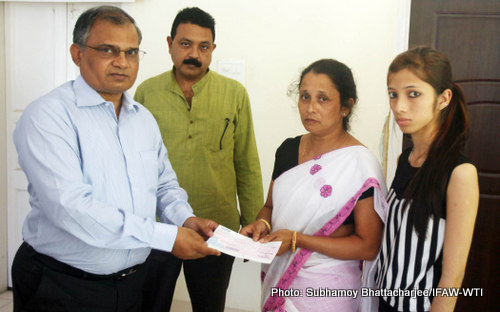 Karuna Mahanta, widow of late Naba Krishna Mahanta, received the cheque from MK Yadava, Director, Kaziranga National Park. Naba Krishna Mahanta, a Forester, died in a road accident while on duty on NH 37 on July 24, 2015. The deceased was undergoing treatment but succumbed to his injuries two days later.