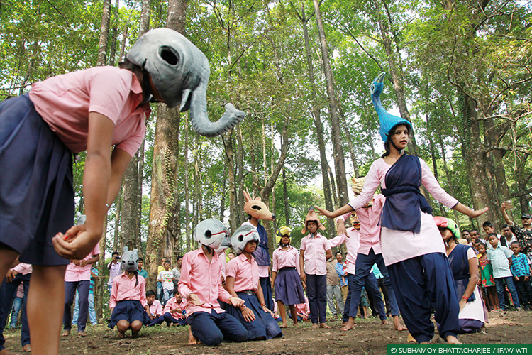 Manas National Park, Assam, October 15, 2017: A street play that emphasises the necessity of flourishing wild habitats and the role of people in destroying or preserving them, performed by students from Bansbari, a village on the fringes of Manas National Park, was staged today on Park Opening Day near the park entrance gate. The performance was organised by IFAW-WTI, the Assam Forest Department and the Bodoland Territorial Council.