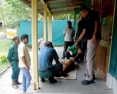 CWRC, Kaziranga, April 23: A hog deer with puncture wounds was rescued and brought to IFAW-WTI run Centre for Wildlife Rehabilitation (CWRC) by the forest staff of the Kaziranga NP. The CWRC team found the injured animal on the outskirts of the central range of the national park.