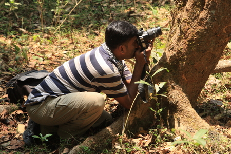 Jose photographing regenration of bamboo, Wayanad WLS
