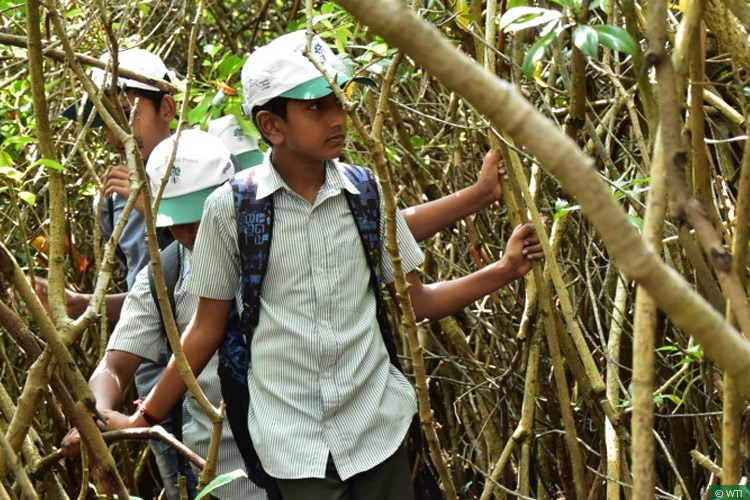 Students trek through the mangroves secured by WTI under the Kannur Kandal Project