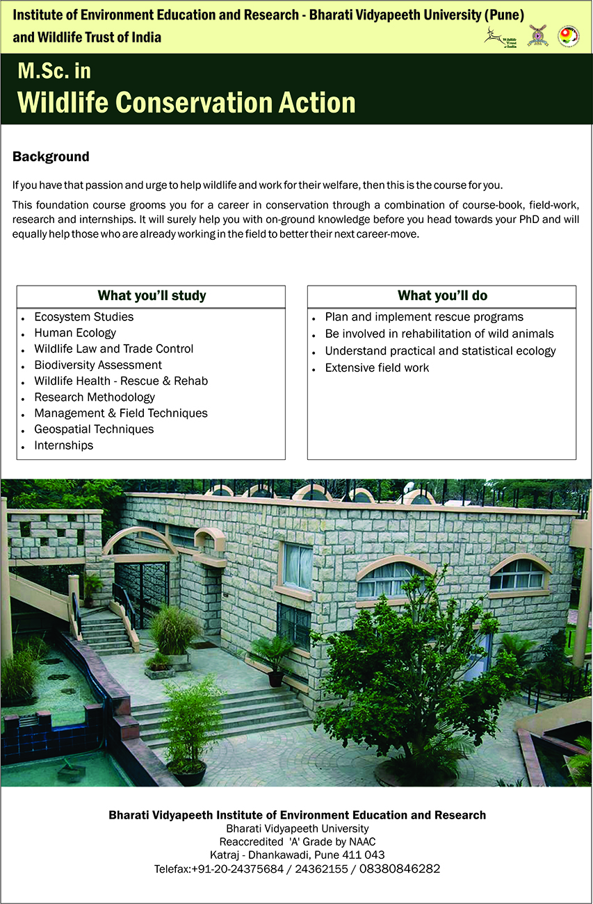 Wildlife conservation has a rapidly expanding horizon – in both national and international at Government and Non-Governmental organizations such as Wildlife Trust of India, World Wide Fund for Nature, ATREE, WII, IUCN, etc. – as environmental and extension educator, researchers as well as managers. The multidisciplinary foundation prepares the student to pursue a career in a variety of conservation related jobs and produces a broad based scientist who can utilize this knowledge to further an academic career through a Ph.D. program. It also provides opportunities for people who are already working in the field to further their career through a formal Diploma course that can be upgraded to a Masters.