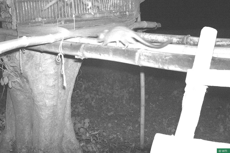 A night vision camera trap image of one of the released civet pups returning to its cage at the acclimatisation site