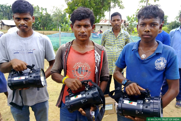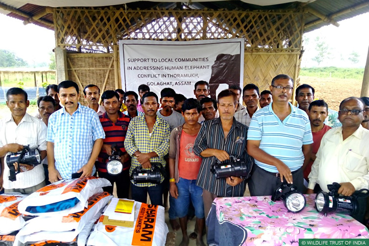Golaghat District, Assam, October 23, 2017: As part of a Rapid Action Project (RAP) initiated by its Wild Aid division, Wildlife Trust of India (WTI), with the support of CAF India and Ms Alka Hingorani (an individual supporter), distributed field equipment to members of six local anti-depredation squads to help them tackle Human Elephant Conflict in the Thoramukh region of Golaghat. The equipment was handed over in the presence of Assam Forest Department officials at a small event organised by representatives of 12 conflict-prone villages on October 14.