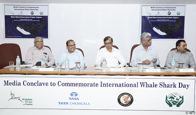 Gandhinagar, Gujarat, September 4, 2016: A media conclave was organised at the Gujarat Ecological Education and Research (GEER) Foundation to mark the 8th International Whale Shark Day on August 30. Key stakeholders of the Whale Shark Conservation Project, started in 2004 by Wildlife Trust of India (WTI) in collaboration with Tata Chemicals Ltd (TCL) and the Department of Forests and Wildlife, Government of Gujarat, and run on the ground with the support of marine fishing communities on the Saurashtra coast, interacted with members of the media on the occasion.