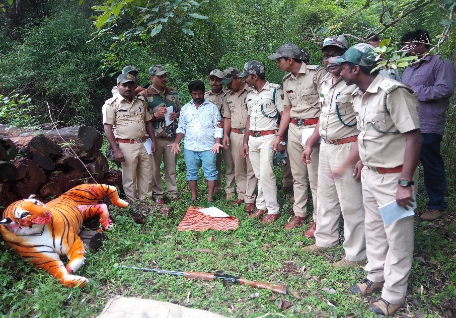 With such an aim to make a difference in the ease of carrying out operations in the field as well as training the frontline staff, Wildlife Trust of India conducts training for the frontline staff under its Van Rakshak Program. The training was conducted from 25th -27th June 2019 for three days. The training session was inaugurated by the Chief Conservator of Forests, Chikmagalur, Mr Vijay Mohan Raj with a lamp lighting ceremony. On the first day of training, all the guests, trainers and forest staff were welcomed by Mr Venkat Naidu with an introductory speech and formal introductions after which Mr Vijay Mohan Raj delivered the inaugural speech on the importance of Wildlife Crime Control Techniques and practices and how they play a crucial role in Wildlife Conservation. Then Mr Venkat gave the outline of the training and explained its importance emphasizing on the need, objectives and the various aspects that would benefit the participants. A pre-training test was conducted post the lecture by Mr Venkat Naidu thus concluding the first session. The post-lunch session was a field practical session that was jointly conducted by Mr V.G. Bandi and Mr Srinivas. A mock crime scene was created which was to be investigated by the participants. Participants were divided into teams. They investigated the crime scene accordingly and prepared the preliminary investigation report for the crime scene. Following this, all the teams were evaluated by the trainers and they were accordingly told about their mistakes and about that correct steps and procedures that should be followed.