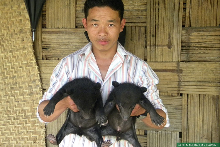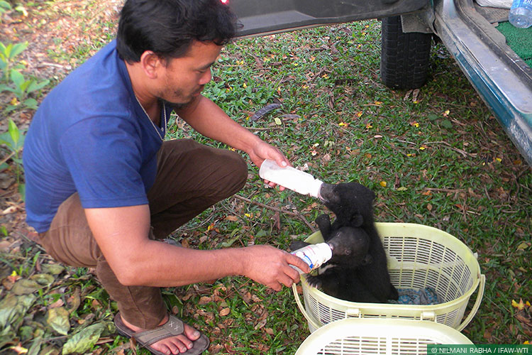IFAW-WTI animal keeper Chipra Mekola with the two bear cubs whose rescue he assisted in