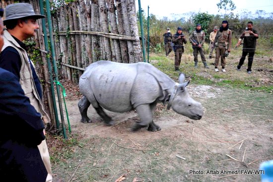 Manas National Park (Assam), 16 February, 2016: Two rhinos, Purabi and Dwimalu, undergoing acclimatisation at an enclosure set up by Wildlife Trust of India, International Fund for Animal Welfare (WTI-IFAW) and the Assam Forest Department were released to the wild in Manas National Park this afternoon. This brings the total count of rhinos released by IFAW-WTI and Assam Forest Department to the magic double digit figure, 10.