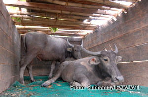Hand raised buffalos of CWRC (IFAW-WTI) wildlife care centre inside the carrier on way to Burchapori Wildlife Sanctuary on 18th March 2015.Photo: Subhamoy Bhattacharjee/IFAW-WTIHand raised buffalos of CWRC (IFAW-WTI) wildlife care centre inside the carrier on way to Burchapori Wildlife Sanctuary on 18th March 2015.Photo: Subhamoy Bhattacharjee/IFAW-WTI