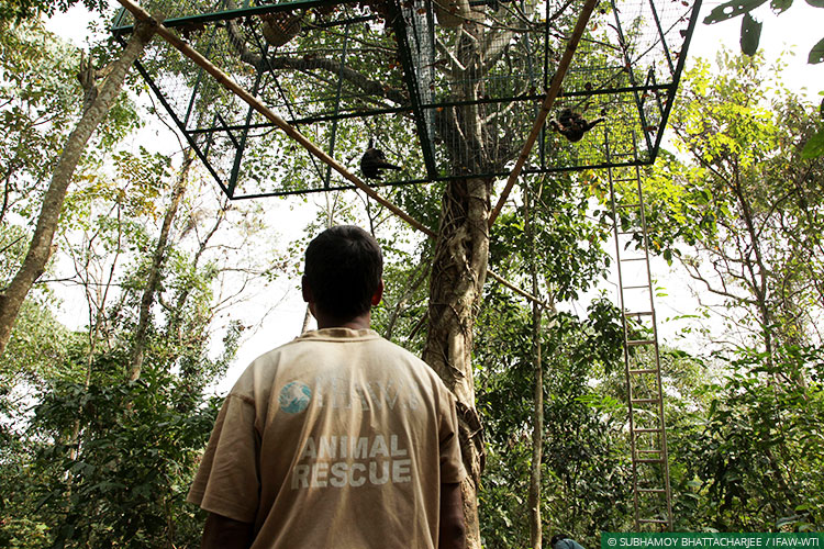 CWRC, Kaziranga National Park, February 27, 2017: A pair of western hoolock gibbons under long-term care at the Centre for Wildlife Rehabilitation and Conservation (CWRC) – the wildlife rescue, care and rehabilitation facility jointly run by the International Fund for Animal Welfare (IFAW), Wildlife Trust of India (WTI) and Assam Forest Department – was shifted to a pre-selected acclimatisation site in the adjoining Panbari Reserve Forest on February 25. This is first step in the gibbons’ soft release protocol, which should eventually see them rehabilitated back into the wild in the Kaziranga-Karbi Anglong landscape.