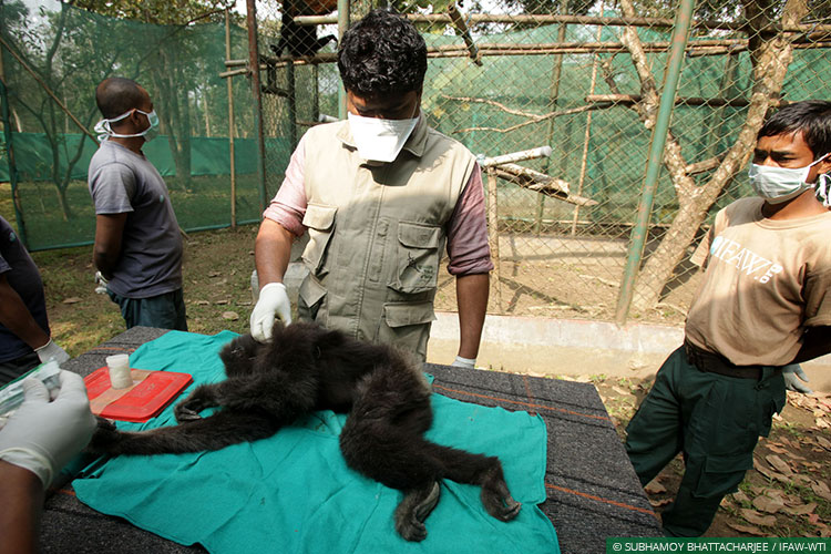 CWRC veterinarian Dr Samshul Ali gives the female hoolock gibbon a check-up prior to her transfer to the acclimatisation site