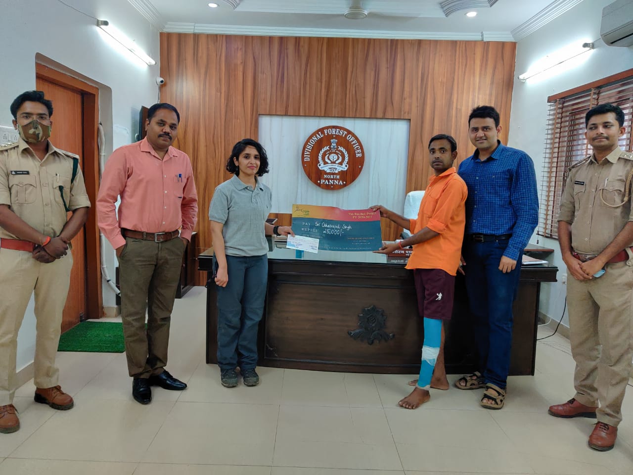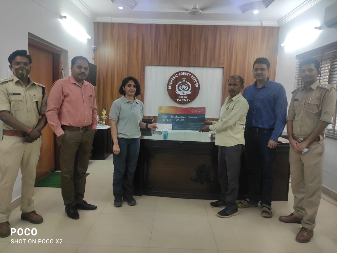In a separate incident reported by the DFO, Panna tiger reserve, two frontline staff were grievously injured in an attack by timber mafia at North Panna Division of the tiger reserve. Chattrapal Singh (beat guard) had fractures in both his legs, while Swamideen (forest worker) was badly injured after being attacked by an axe on his shoulder and legs. They were admitted to the Panna Govt hospital and are recuperating. Both of them received financial support as bank cheques handed over by WTI in the presence of the Gaurav Sharma, DFO Panna tiger reserve.