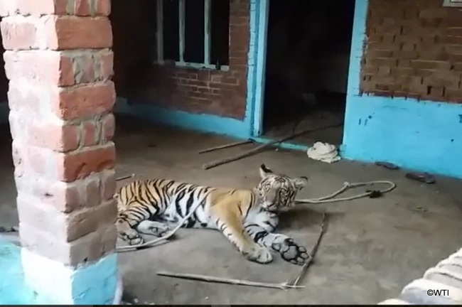 The tiger, a sub-adult male, had moved out of the Mahof range of Pilibhit TR and into Mallpur Khajuria Village about a kilometre from the edge of the forest. It entered the home of a villager named Jagdish at around 7.30am; Jagdish’s wife was making tea in the kitchen area when she saw the tiger and raised the alarm, waking her husband. The family fled the house and a large crowd of villagers gathered around it as news spread of the cat’s presence, effectively trapping the animal within.