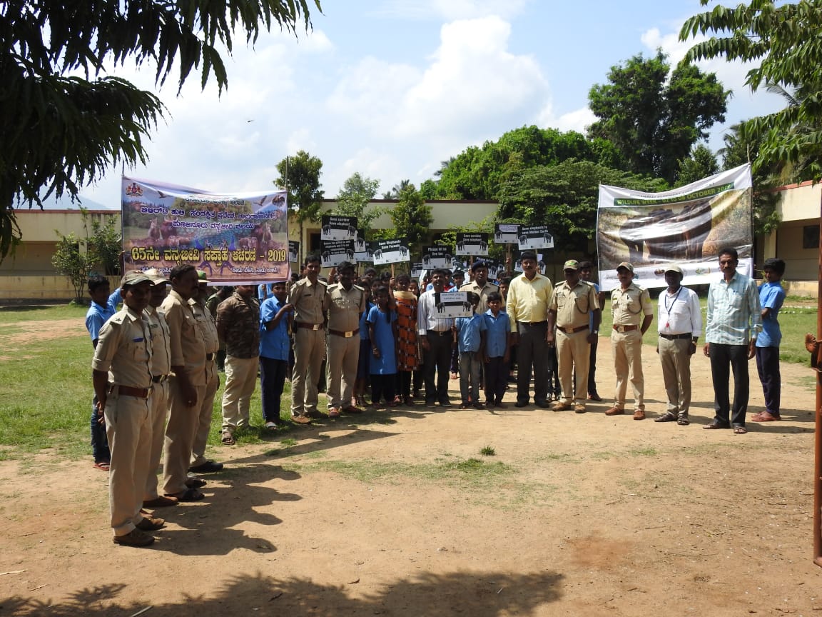 Wildlife Week was celebrated jointly by WTI, World Land Trust (WLT), Sri Swami Vivekananda Seva Trust and Karnataka Forest Department in Govt. High School, Kolipalya, on 4th October 2019 as a part of Mudahalli Elephant Link project. WTI-WLT team has been working since 2016 to secure the Chamrajnagar-Talamalai at Mudahalli Elephant Corridor. Awareness rally was conducted in Kolialya village followed by drawing competition, essay writing competition, and quiz for the students. The winners were felicitated with awards. The Forest Range Officer of Punajanuru Range, BRT Tiger Reserve talked about the importance of wildlife conservation. About 80 students, 10 forest staff, and 6 teachers participated in the program.