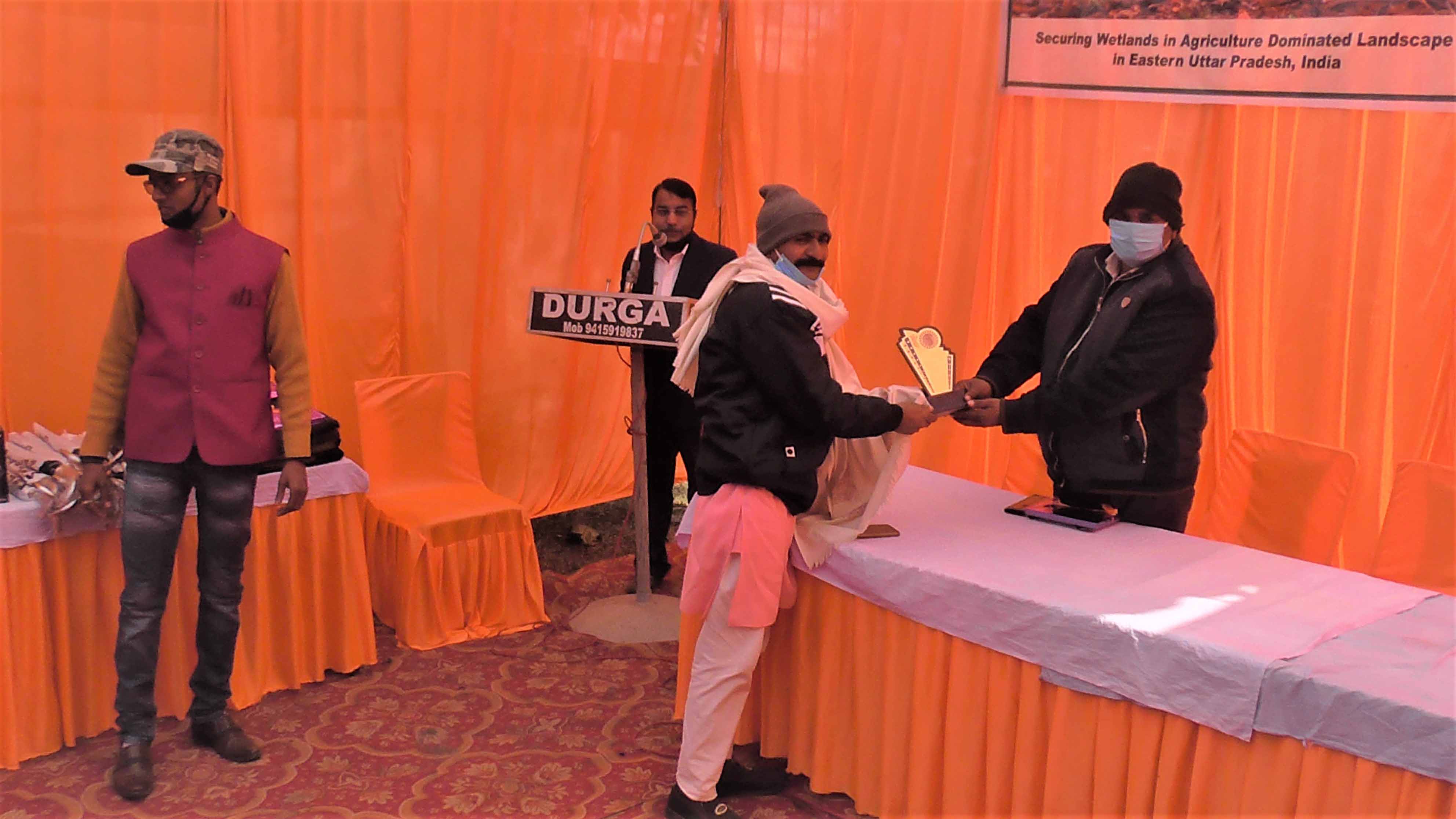 Farmers and volunteers from 10 eastern districts of Uttar Pradesh were felicitated for their Sarus Crane conservation efforts in its natural habitat of agricultural fields and small wetlands. Community efforts by farmers in these districts in protecting the Sarus nests resulted in 98% of successful hatching last year of sarus nest eggs, with 2300 sarus cranes recorded present in these 10 districts last year. 15 farmers were felicitated by the Sub Divisional Officer and Range Officers of Nichlaul and Madhawalia Forest Ranges this year.