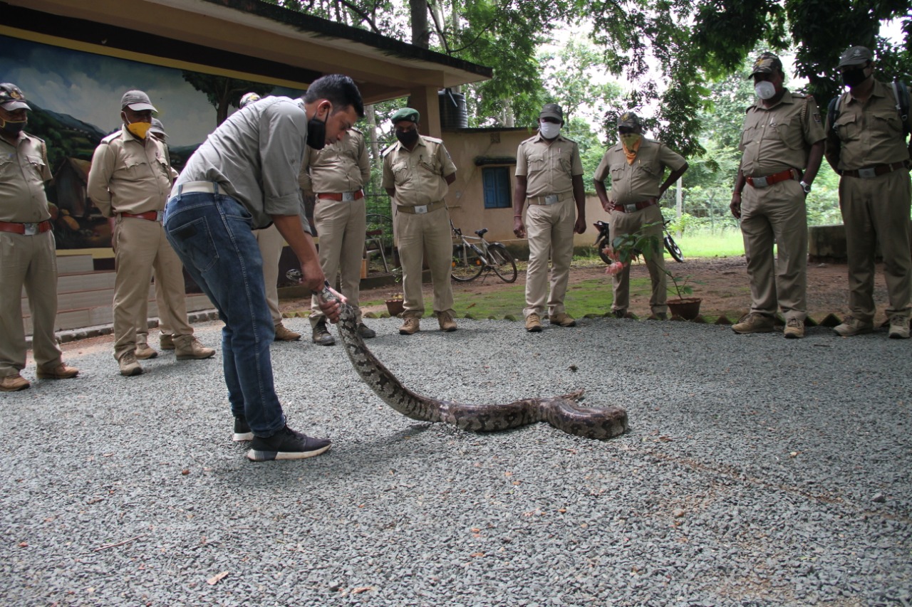A practical session on safe rescue methods of snakes was also demonstrated by Rudra Mahapatra. Appropriate handling of large snakes, Bag and pipe method, snake box management and importance of micro chipping was advised during this session.