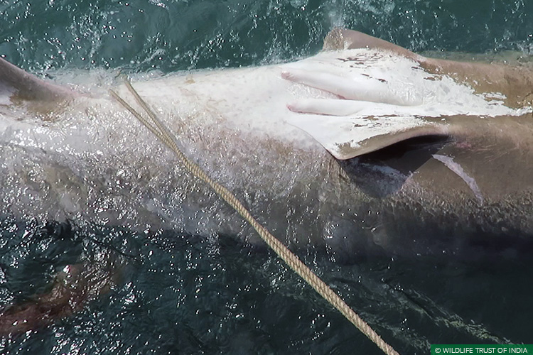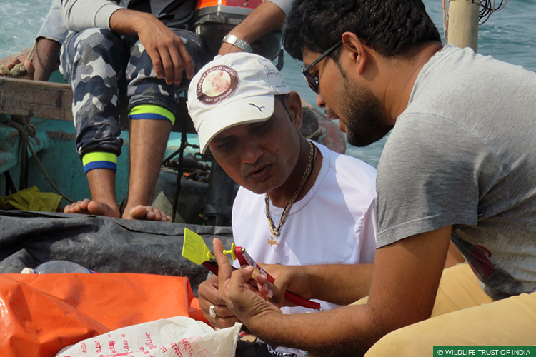 On November 11, 2017, an OBM fisherman named Mohan Pancha Chauhan informed the WTI rescue team that a whale shark was entangled in his fishing nets off the Sutrapada coast. As per procedure, the Deputy Conservator of Forest, Junagadh was informed and local forest officials were involved in the rescue and tagging operation. The WTI team collected a tissue sample for genetic analysis, after which the satellite tag was attached and the whale shark freed. The deployed tag was programmed to transmit signals every day for the first 20 days and every alternate day following that.