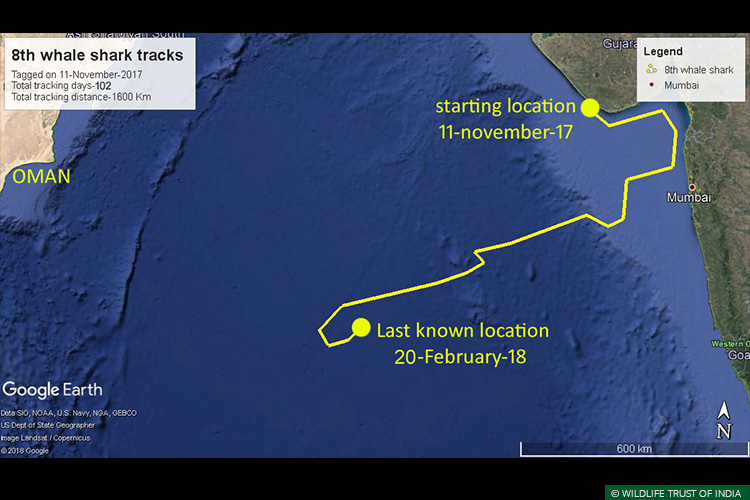 Sutrapada, Gujarat, February 27, 2017: The migratory path of a male whale shark that had been satellite-tagged off the Saurashtra coast in November 2017 under the Whale Shark Conservation Project – run by Wildlife Trust of India (WTI) and the Gujarat Forest Department with support from Tata Chemicals Ltd – has now been monitored via satellite for over 100 days. The tagged whale shark is currently in international waters between India and Oman. It has travelled a distance of approximately 1600 km.