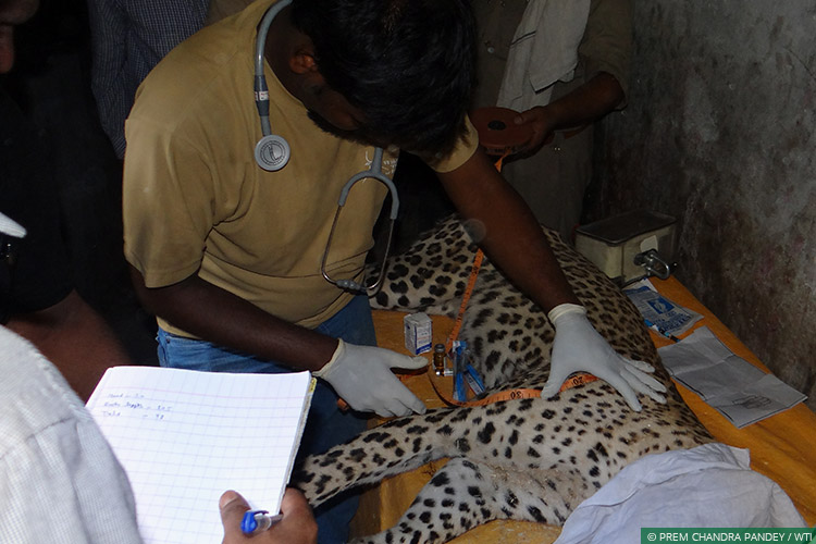 The leopard being examined by WTI veterinarian Dr Aaron Wesly after it was tranquilised
