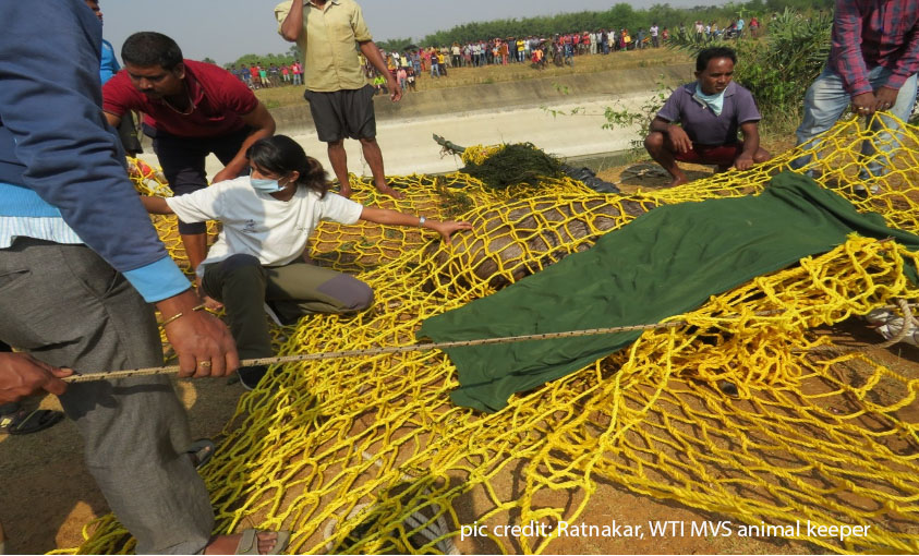 After discussing and assessing the situation, it was decided that a physical capture of the animal would be the best way to bring the animal out of the canal where it was stranded, since tranquilizing an animal inside water could prove risky. With some help of the local community members and forest staff, the animal was gently nudged on to a thick polythene sheet. Accordingly, a makeshift structure (sort of a sledge) was made using bamboo poles, rope nettings and a polythene sheet to secure the animal as it was gently shifted onto the structure.