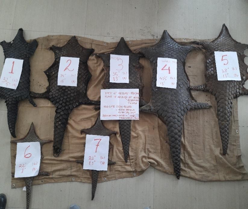The joint enforcement team of WCCB and state forest department successfully executed the enforcement operation on 18th February 2021 and took two persons (one female and one male) into custody and recovered seven Chinese pangolin skins and one live Chinese pangolin from their possession in a hotel near new Tinsukia Junction, Assam.